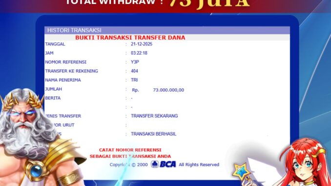 SLOT DI GATES OF OLYMPUS. Kemenangan sebesar Rp 73.000.000,-. telah dibayarkan LUNAS oleh pihak bolagila kepada pemilik user id setelah yang bersangkutan mengisi formulir withdraw. Proses pencairan dana berlangsung sangat cepat hanya dalam waktu 6-11 menit Sudah berada dalam rekening pemilik user id.