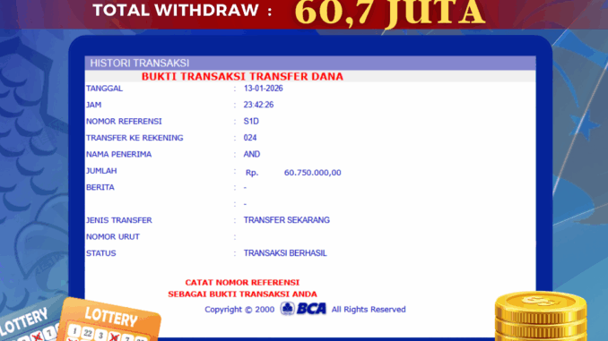 Bukti transfer yang dapat anda lihat adalah bukti SAH / VALID yang langsung di dapatkan melalui bukti transaksi dari Bank yang digunakan untuk pengiriman dana pada rekening pemilik user id. Terima kasih kami sampaikan kepada para pengguna setia BOLAGILA yang telah menggunakan situs kami, sebagai Bandar Terpercaya yang pastinya membayar semua kemenangan member hingga lunas. Apakah BOLAGILA PENIPU ? Reputasi “BOLAGILA TERPERCAYA” sudah sangat melekat.