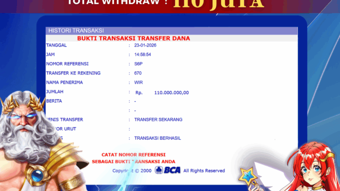 BOLAGILA mengucapkan selamat kepada user id : MEI*** yang telah berhasil mendapatkan jackpot pada permainan SLOT DI GATES OF OLYMPUS. Kemenangan sebesar Rp 110.000.000,-. telah dibayarkan LUNAS oleh pihak bolagila kepada pemilik user id setelah yang bersangkutan mengisi formulir withdraw. Proses pencairan dana berlangsung sangat cepat hanya dalam waktu 6-11 menit sudah berada dalam rekening pemilik user id.