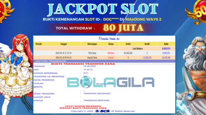 BOLAGILA mengucapkan selamat kepada user id : DOC*** yang telah berhasil mendapatkan jackpot SLOT DI MAHJONG WAYS 2. Kemenangan sebesar Rp 80.000.000,-. telah dibayarkan LUNAS oleh pihak bolagila kepada pemilik user id setelah yang bersangkutan mengisi formulir withdraw. Proses pencairan dana berlangsung sangat cepat hanya dalam waktu 6-11 menit Sudah berada dalam rekening pemilik user id.