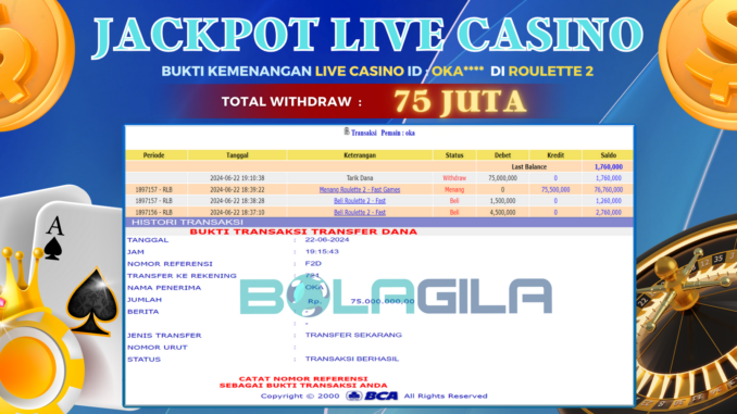 BOLAGILA JACKPOT LIVE CASINO DI ROULETTE 2 Rp 75.000.000,- LUNAS