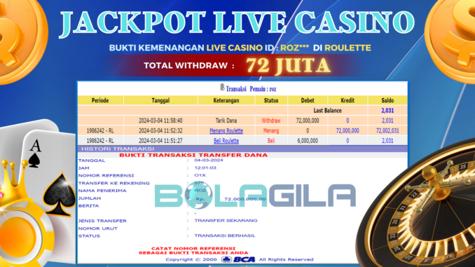 BOLAGILA mengucapkan selamat kepada user id : ROZ*** yang telah berhasil mendapatkan jackpot LIVE CASINO DI ROULETTE. Kemenangan sebesar Rp 72.000.000,-. telah dibayarkan LUNAS oleh pihak bolagila kepada pemilik user id setelah yang bersangkutan mengisi formulir withdraw. Proses pencairan dana berlangsung sangat cepat hanya dalam waktu 6-11 menit sudah berada dalam rekening pemilik user id.
