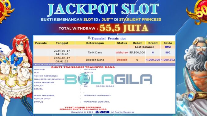 BOLAGILA mengucapkan selamat kepada user id : JUS*** yang telah berhasil mendapatkan JACKPOT SLOT DI STARLIGHT PRINCESS. Kemenangan sebesar Rp 55.500.000,-. telah dibayarkan LUNAS oleh pihak bolagila kepada pemilik user id setelah yang bersangkutan mengisi formulir withdraw. Proses pencairan dana berlangsung sangat cepat hanya dalam waktu 6-11 menit s