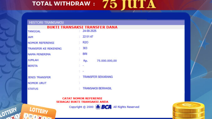Bukti transfer yang dapat anda lihat adalah bukti SAH / VALID yang langsung di dapatkan melalui bukti transaksi dari Bank yang digunakan untuk pengiriman dana pada rekening pemilik user id. Terima kasih kami sampaikan kepada para pengguna setia BOLAGILA yang telah menggunakan situs kami, sebagai Bandar Terpercaya yang pastinya membayar semua kemenangan member hingga lunas. Apakah BOLAGILA PENIPU ? Reputasi “BOLAGILA TERPERCAYA” sudah sangat melekat.